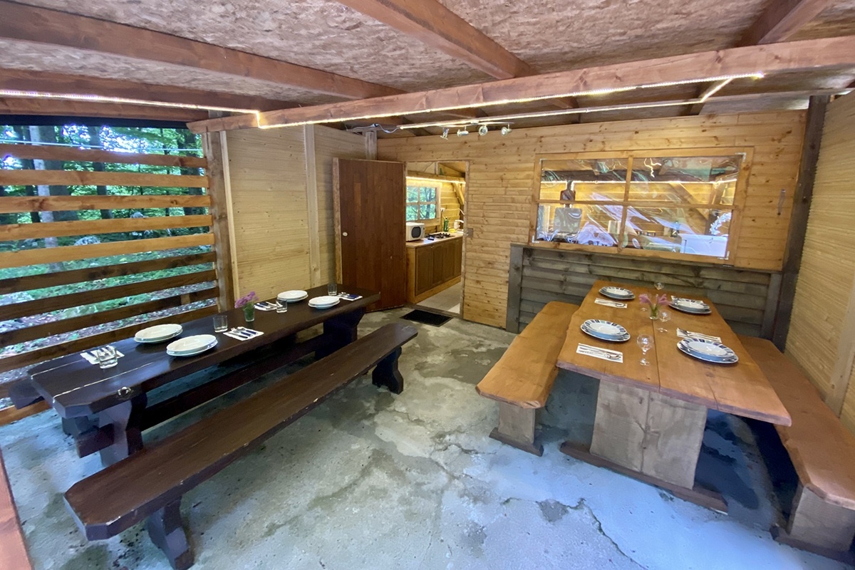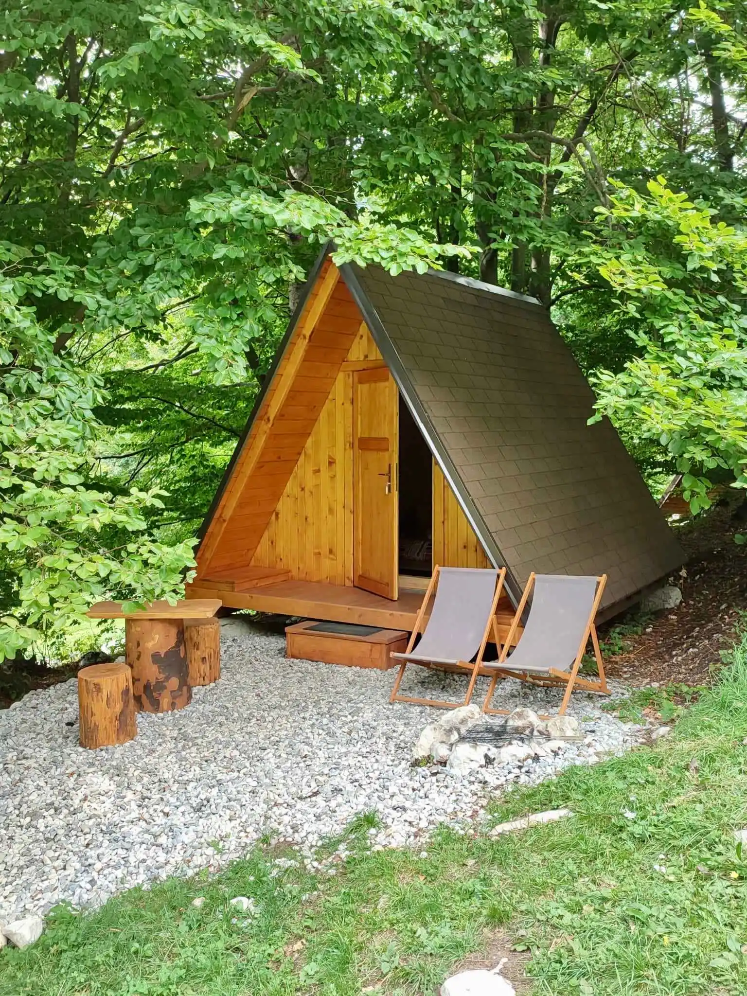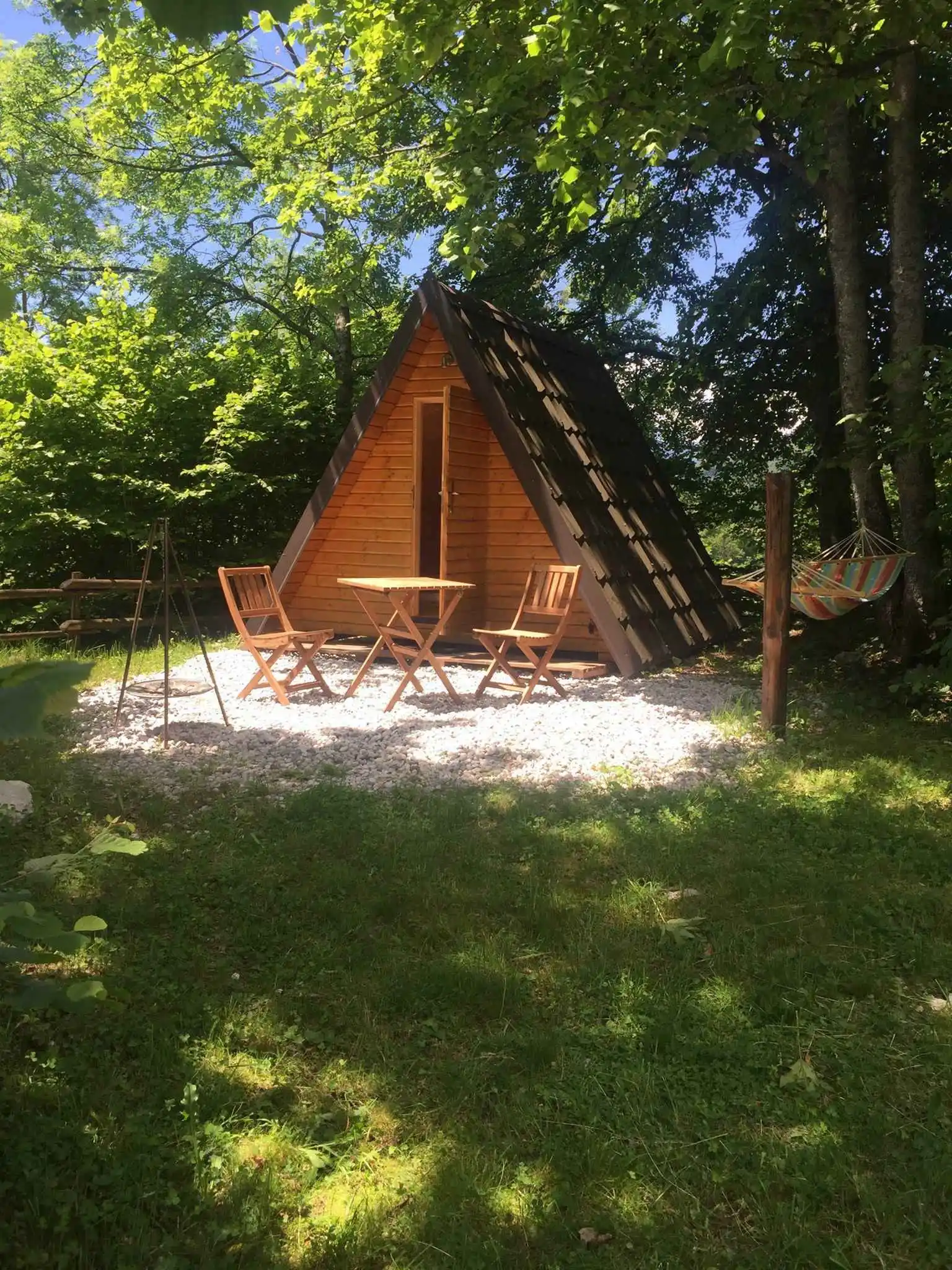 Nastanitev je možna v šestih lesenih hišicah, ki so obdana s prijetno senco dreves in travniki. Vsaka hišica je opremljena z ležišči s posteljnino, elektriko ter mini hladilnikom. Pred hišico je vrtna garnitura, viseča mreža in urejeno kurišče, kjer lahko v poletnih nočeh, pod zvezdnatim nebom in ob prasketanju ognja, pričarate še prav posebno doživetje.